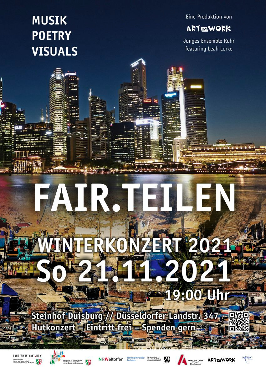 FAIR.TEILEN – eine Produktion des Jungen Ensemble Ruhr, die sich in Musik, Poetry (Leah Lorke) und Visuals (Medienbunker Marxloh) mit Erfahrungen zunehmender Ungerechtigkeit und Spaltung auseinandersetzen. Zum Ende eines in vieler Hinsicht aufreibenden Jahres will das Ensemble Hoffnung und Mut, Freude am Miteinander, an Vielfalt und einem solidarischen Leben vermitteln. Es will den Anliegen derer eine Bühne geben, die unsere Solidarität brauchen.