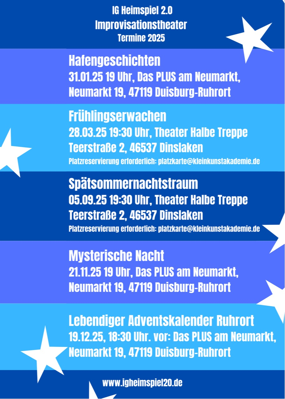 Leinen los für einen unvergesslichen Abend! Die Show „Hafengeschichten“ entführt euch in die lebendige Welt des Hafens – voller Überraschungen, Humor und spontaner Wendungen. Am 31.01.25 verwandelt sich das PLUS am Neumarkt in Duisburg-Ruhrort in eine Bühne für Geschichten, die so einzigartig sind wie die Inspirationen des Publikums. Seid dabei, wenn eure Ideen zu unvorhersehbaren Szenen werden und das Flair des Ruhrorter Hafens zum Leben erwacht. Ob lustig, dramatisch oder völlig absurd – hier ist alles möglich!