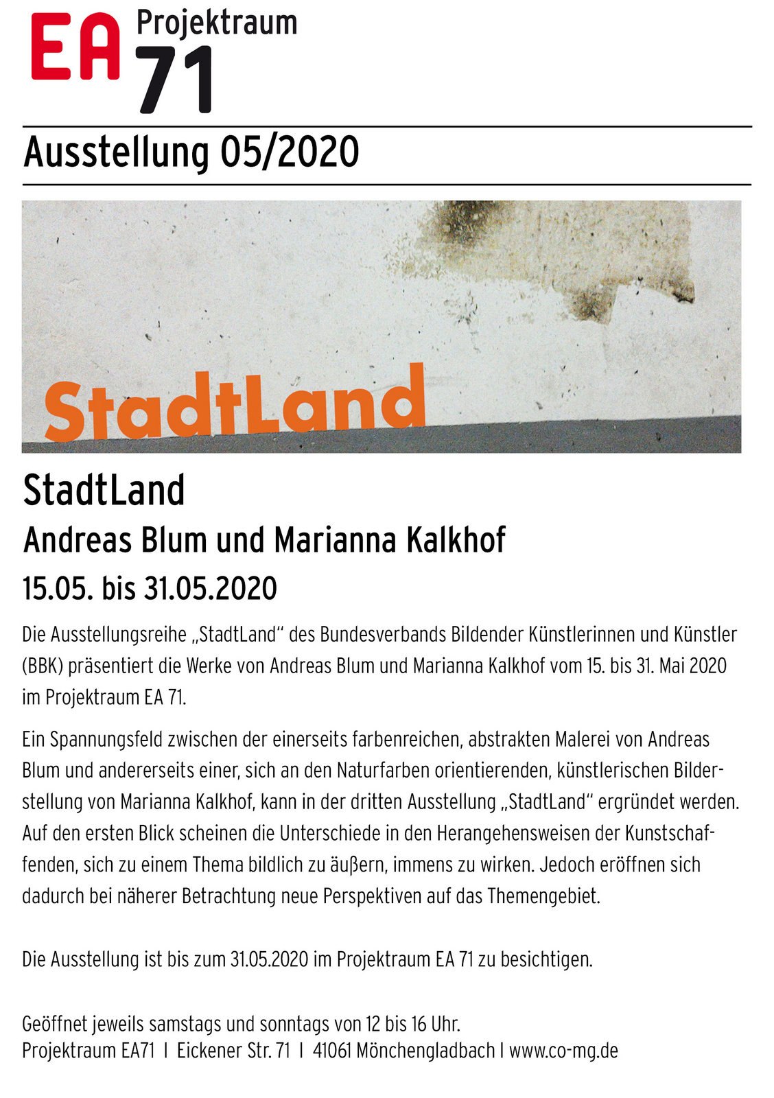 StadtLand ist eine jährliche Ausstellungsreihe des BBK Niederrhein, gefördert durch das Kulturbüro der Stadt Mönchengladbach und dem Projektraum EA71. In diesem Jahr wurden Marianna Kalkhof und Andreas Blum für die Ausstellung ausgewählt. Die Ausstellung ist im Projektraum EA 71 in Mönchengladbach aufgebaut und es wurden Videos mit einer Eröffnungsrede, Künstlergesprächen und einem Ausstellungsrundgang gedreht. Als Eröffnung der Ausstellung werden die Videos auf dem neuen Youtube-Kanal des BBK Niederrhein ins Netz gestellt - Link: "Mehr". Durch die Lockerung bei den Einschränkungen für Ausstellungsbesuche ist die physische Ausstellung im EA 71 zu den angekündigten Öffnungszeiten, samstags und sonntags, jeweils von 12 Uhr - 16 Uhr geöffnet. Unter Hygieneauflagen dürfen sich neben einer Aufsichtsperson vier Besucher gleichzeitig in dem Projektraum aufhalten.