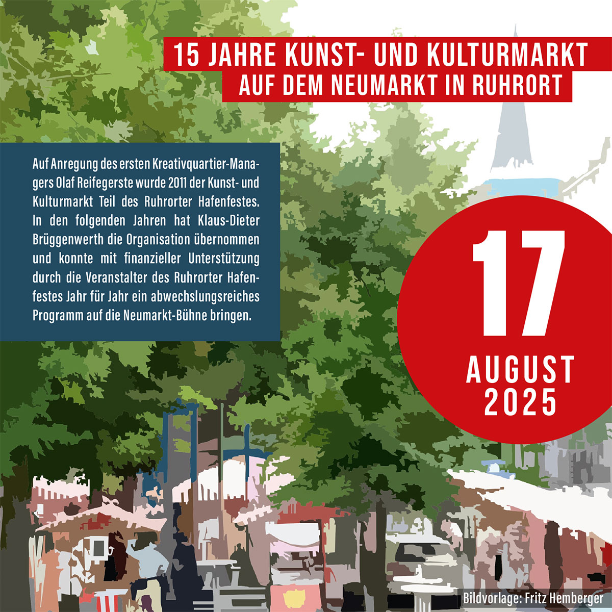 Auf Anregung des Kreativquartier-Managers Olaf Reifegerste wurde 2011 der Kunst- und Kulturmarkt auf dem Neumarkt Teil des Ruhrorter Hafenfestes. In den folgenden Jahren hat Klaus-Dieter Brüggenwerth die Organisation übernommen und konnte mit finanzieller Unterstützung durch die Veranstalter des Ruhrorter Hafenfestes Jahr für Jahr ein abwechslungsreiches Programm auf die Neumarkt-Bühne bringen. Ein Projekt im Rahmen von Kreativ.Quartiere, gefördert vom Ministerium für Kultur und Wissenschaft des Landes NRW und umgesetzt von ecce - european centre for creative economy