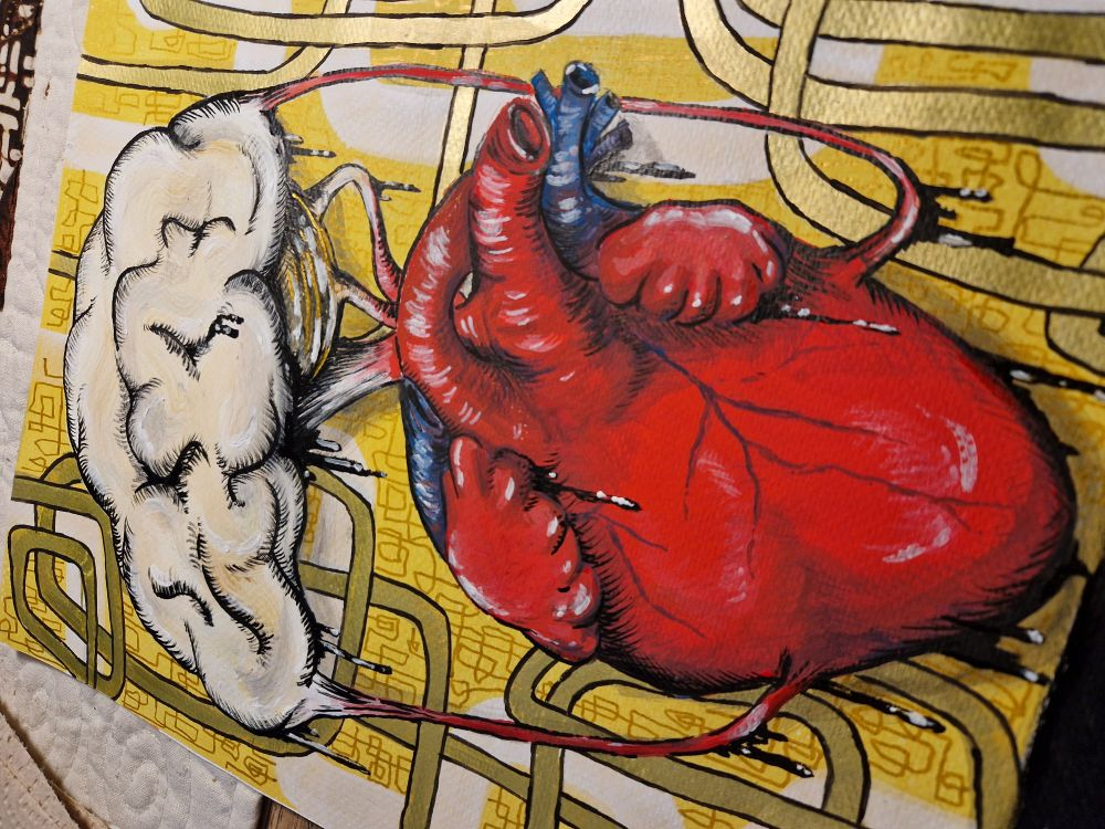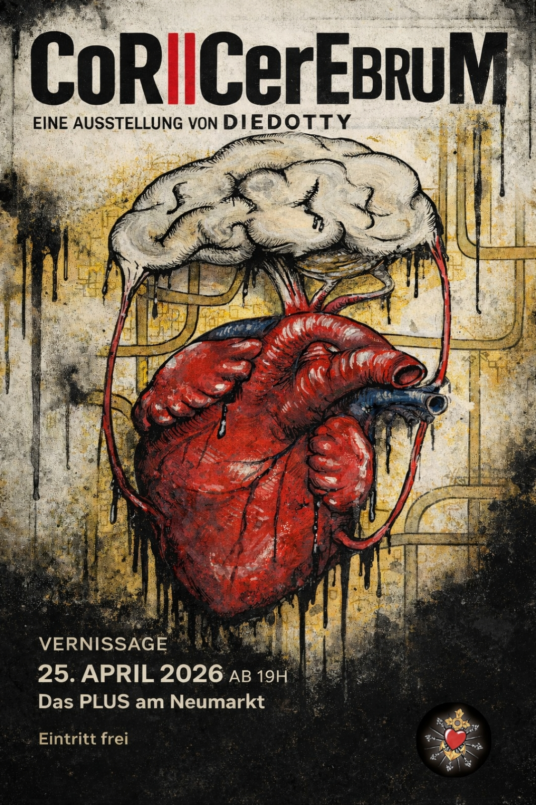 DARGEBOTEN | Die Dotty - CoR||CerEbruM - Ausstellungseröffnung In CoR||CerEbruM setzt sich DieDotty mit anatomischen Formen als bildnerischem Ausgangspunkt auseinander. Herz und Gehirn erscheinen als konkrete, körperliche Strukturen – untersucht, vergrößert, materialisiert und in unterschiedliche Medien übersetzt. Die Arbeiten bewegen sich zwischen Malerei und Objekt. Organische Details wie Gefäßverläufe, Oberflächenstrukturen und Volumen werden betont, verfremdet oder plastisch übersteigert. Die Ausstellung zeigt Anatomie nicht als medizinische Illustration, sondern als künstlerisches Untersuchungsfeld zwischen Präzision, Überzeichnung und räumlicher Inszenierung. Stefanie Wenders (Jahrgang 1985) ist unter dem Pseudonym "Die Dotty" vielen in der Ruhrorter Kunstszene, insbesondere als Street-Art-Künstlerin bekannt. Ihr Repertoire reicht von Stencil-Art über Aquarell- und Acrylmalerei bis zu ausgefallenen Collagen und Karikaturen. DARGEBOTEN | Die Dotty - CoR||CerEbruM - Ausstellungseröffnung Samstag, 25. April 2026, 19 Uhr Das PLUS am Neumarkt, Neumarkt 19, 47119 Duisburg-Ruhrort Eintritt frei(willig) - Hutveranstaltung Die Ausstellung ist vom 25.4. - 21.6.2026 zu den Öffnungszeiten des Projektladens zu besuchen: Di, Mi + Do 10:00-13:00