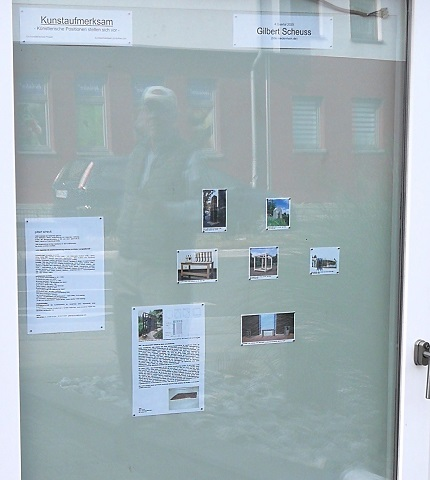 Im 4. Quartal 2020 wird Gilbert Scheuss das Kunstaufmerksam-Fenster in der Dinslakener Innenstadt bespielen. Seine Präsentation wird ab dem 1. Oktober in dem Fenster links neben der Pforte der Hans-Böckler-Straße 10-12 in Dinslaken, dem sogenannten City Tower, für etwa 3 Monate zu sehen sein. Das künstlerische Projekt "Kunstaufmerksam - künstlerische Positionen stellen sich vor" möchte in die Gedanken- und Schaffenswelten eingeladener künstlerischer Positionen entführen. In dem Projekt geht es um die Vermittlung der künstlerischen Position anhand von Informationen und beispielhaftem Anschauungsmaterial. Link: kunstaufmerksam.jimdofree.com, Ort: Hans-Böckler-Straße 10-12, 46535 Dinslaken. Öffnungszeiten: Die Präsentation ist jederzeit von außen einsehbar. (Foto: "Kunstaufmerksam"-Fenster, 4. Quartal 2020: Gilbert Scheuss)