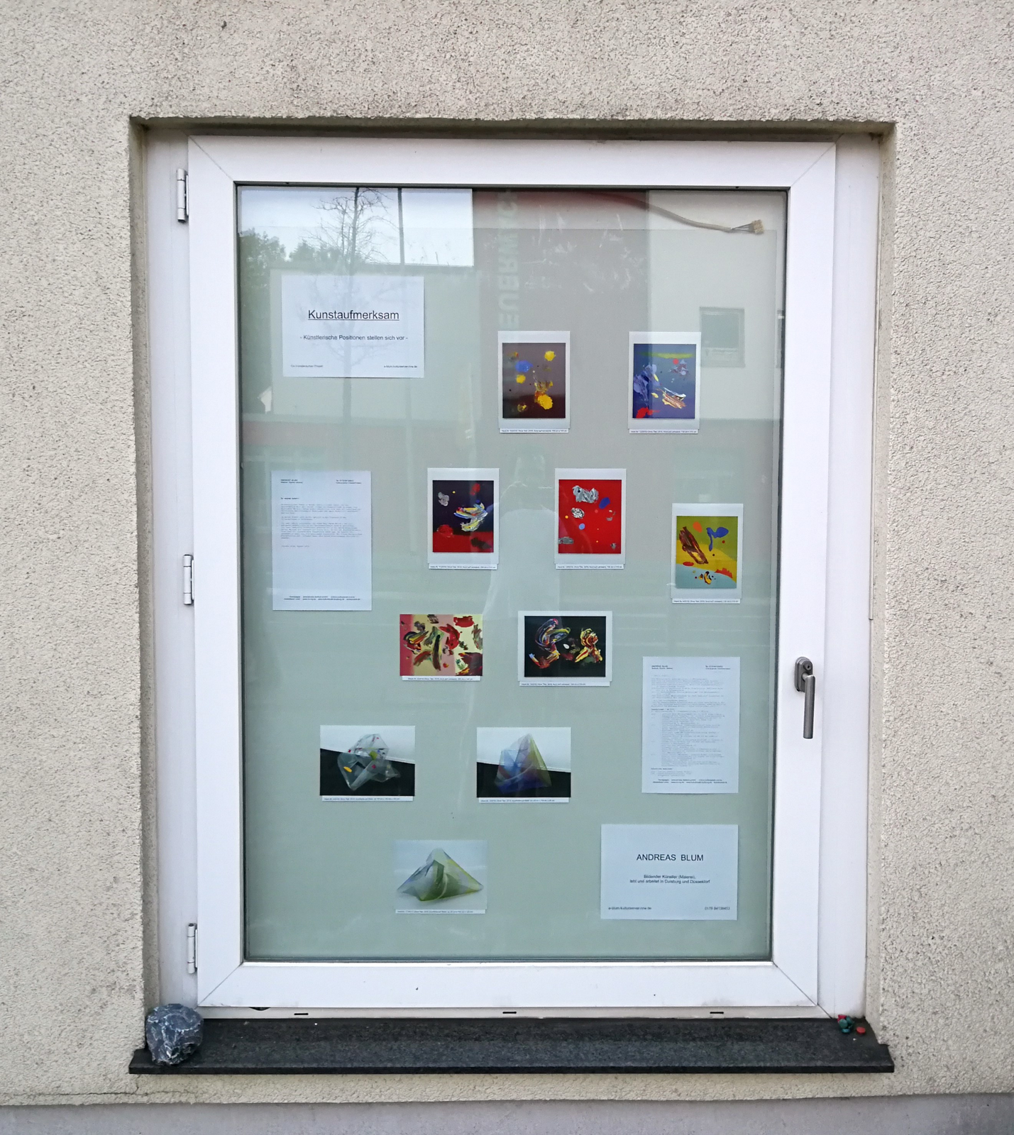 Das im August 2019 von Andreas Blum ins Leben gerufene Projekt “Kunstaufmerksam“ bespielt einen Schaukasten bzw. ein Fenster mit einer direkt dahinter liegenden Magnettafel (Fensterdurchsicht ca. H 162 cm x B 112 cm) links neben der Pforte der Hans-Böckler-Straße 10-12 in Dinslaken, dem sogenannten City Tower. Eingeladene künstlerische Positionen stellen sich mit Anschauungsmaterial (Fotos, ggf. Zeichnungen o.Ä.), Vita und einem Text vor. (Foto: "Kunstaufmerksam"-Fenster Aug.-Dez. 2019: Andreas Blum)